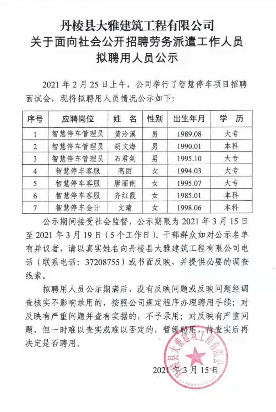 【大雅建筑公司】關(guān)于面向社會(huì )公開(kāi)招聘勞務(wù)派遣工作人員擬聘用人員公示