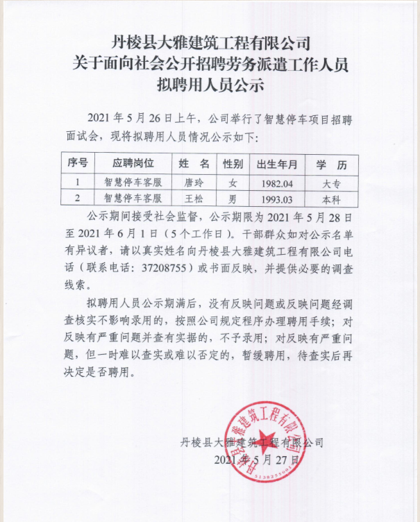 【大雅建筑公司】 關(guān)于面向社會(huì )公開(kāi)招聘勞務(wù)派遣工作人員 擬聘用人員公示