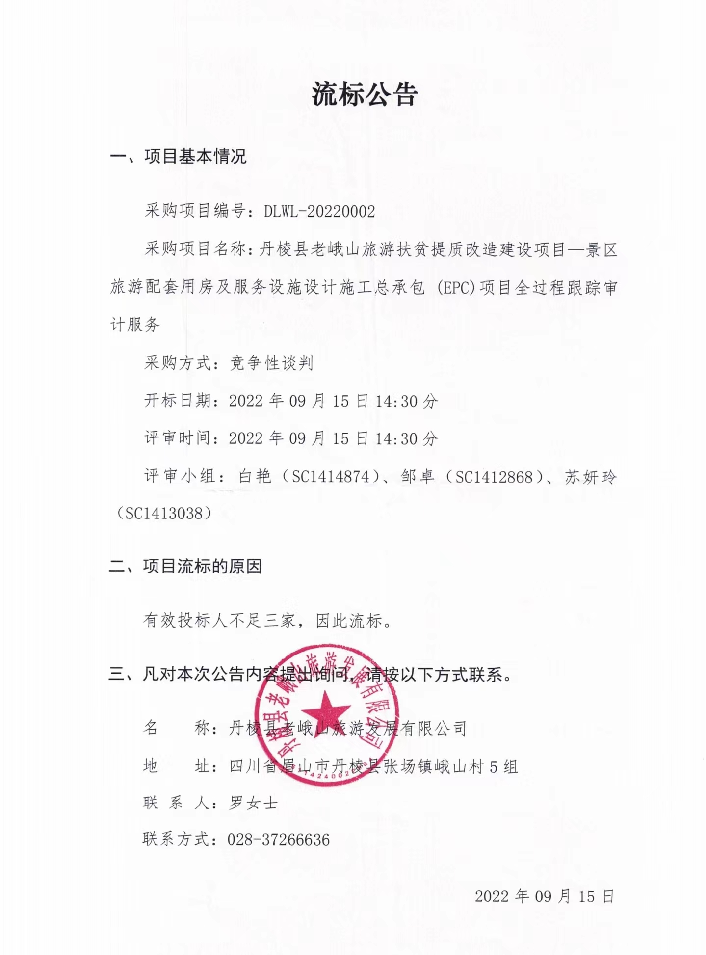 丹棱縣老峨山旅游扶貧提質(zhì)改造建設項目--景區旅游配套用房及服務(wù)設施設計施工總承包(EPC)項目全過(guò)程跟蹤審計服務(wù)流標公告