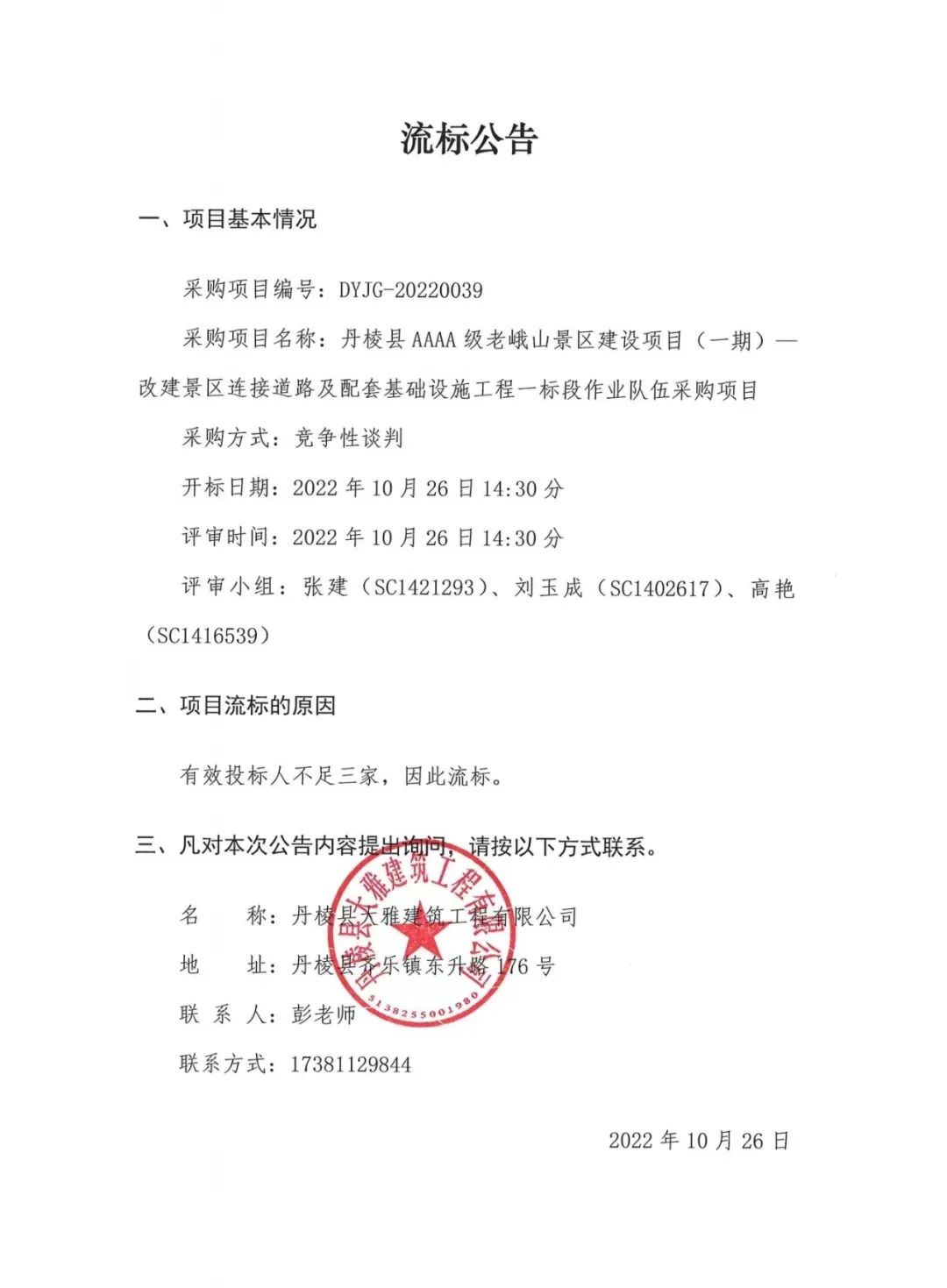 丹棱縣AAAA級老峨山景區建設項目(一期)--改建景區連接道路及配套基礎設施工程一標段作業(yè)隊伍采購項目流標公告