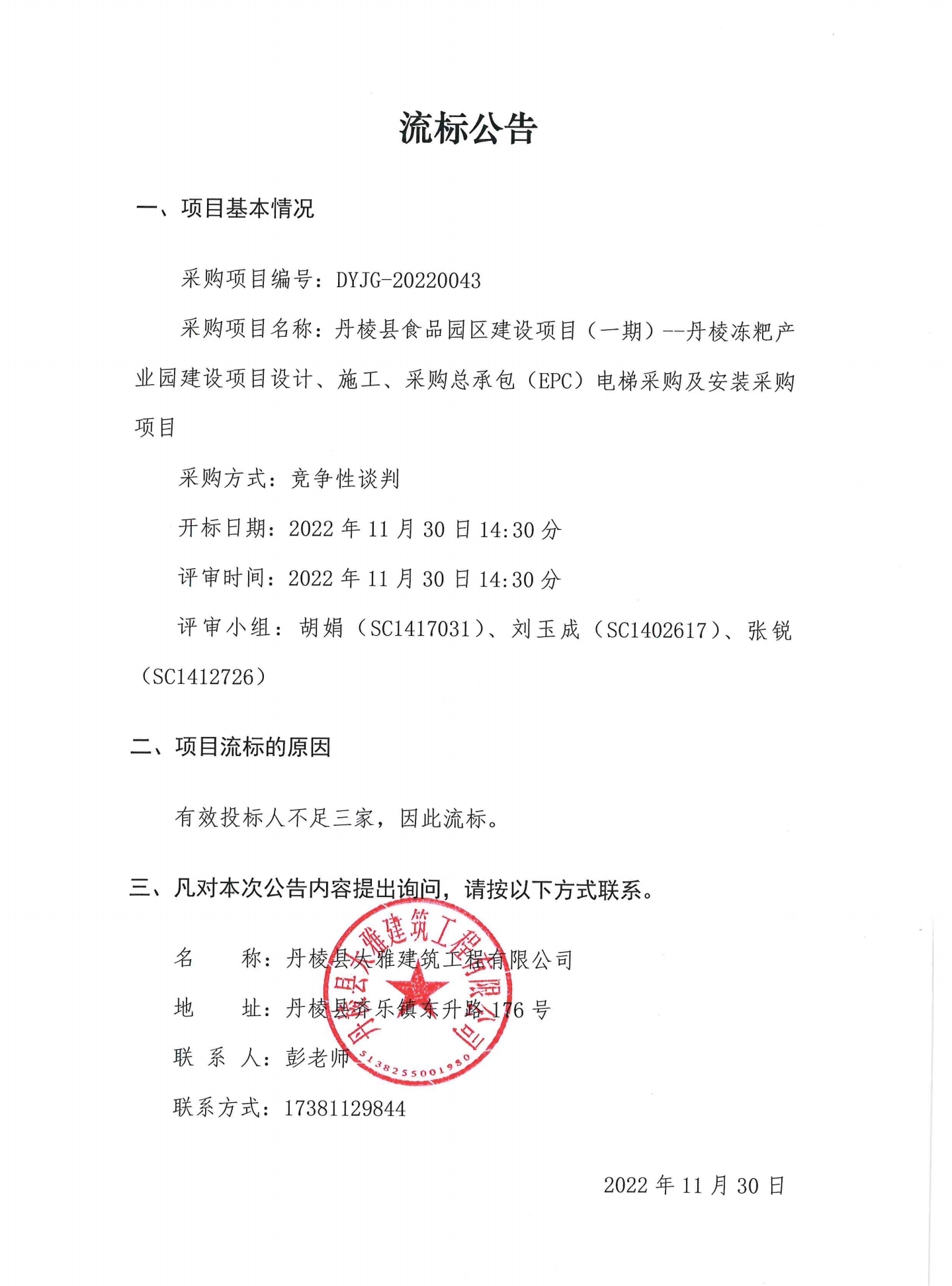 丹棱縣食品園區建設項目 (一期)--丹棱凍粑產(chǎn)業(yè)園建設項目設計、施工、采購總承包 (EPC) 電梯采購及安裝采購項目流標公告