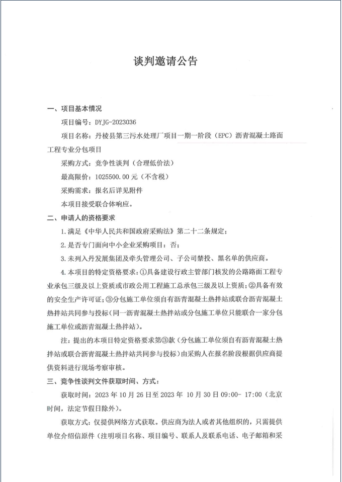 丹棱縣第三污水處理廠(chǎng)項目一期一階段(EPC)瀝青混凝土路面工程專(zhuān)業(yè)分包項目談判邀請公告