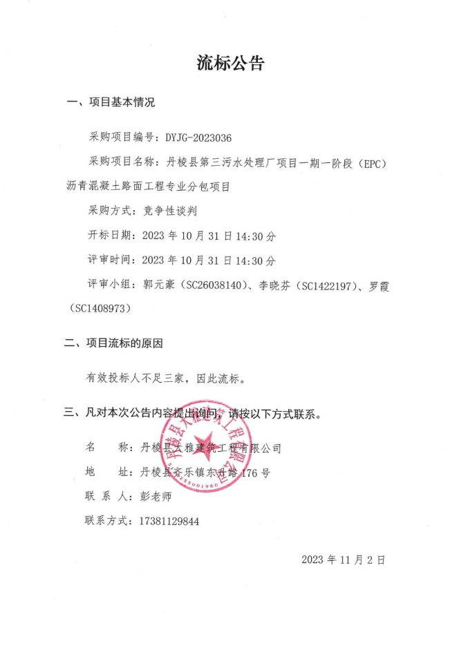 丹棱縣第三污水處理廠(chǎng)項目一期一階段(EPC)瀝青混凝土路面工程專(zhuān)業(yè)分包項目流標公告