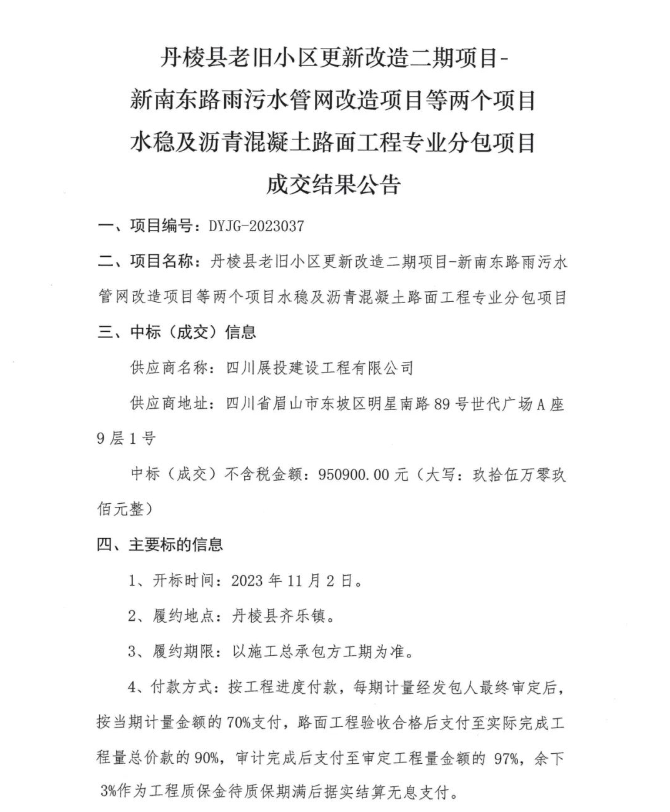 丹棱縣老舊小區更新改造二期項目-新南東路雨污水管網(wǎng)改造項目等兩個(gè)項目水穩及瀝青混凝土路面工程專(zhuān)業(yè)分包項目成交結果公告