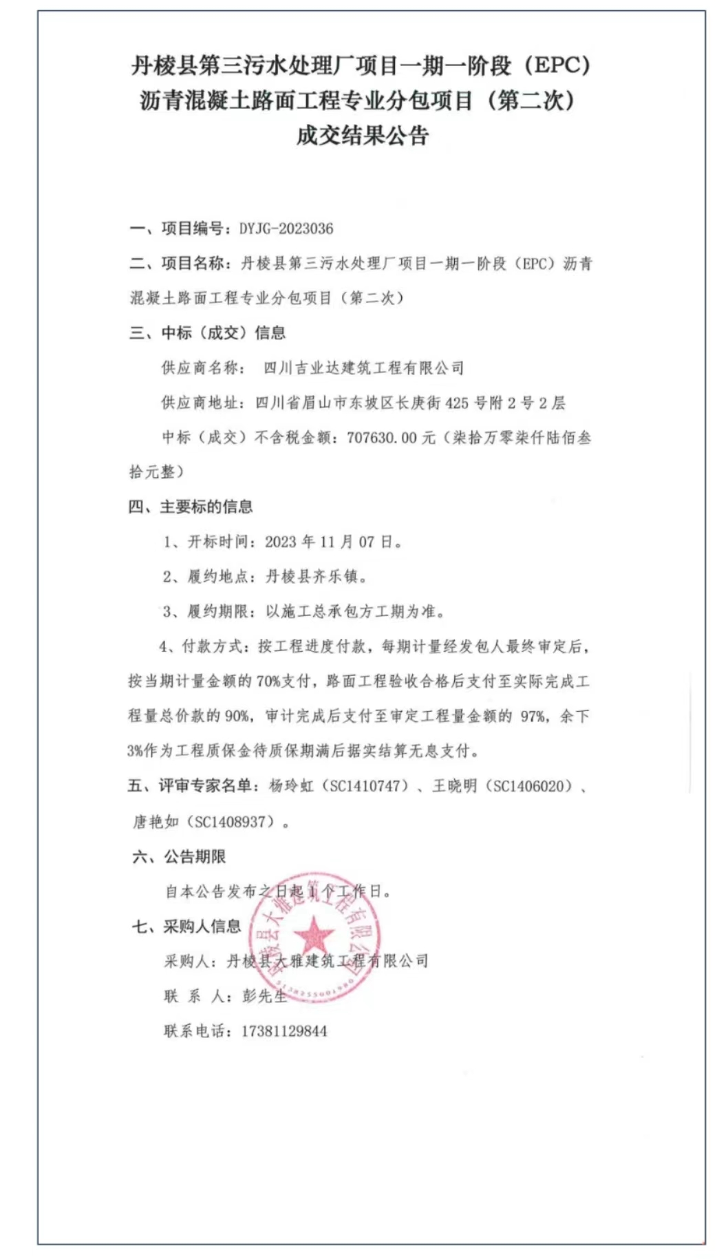 丹棱縣第三污水處理廠(chǎng)項目一期一階段(EPC)瀝青混凝土路面工程專(zhuān)業(yè)分包項目(第二次)成交結果公告