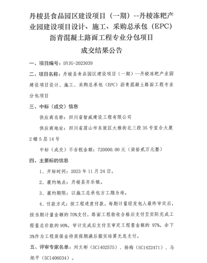 丹棱縣食品園區建設項目(一期)—丹棱凍粑產(chǎn)業(yè)園建設項目設計、施工、采購總承包(EPC)瀝青混凝土路面工程專(zhuān)業(yè)分包項目成交結果公告
