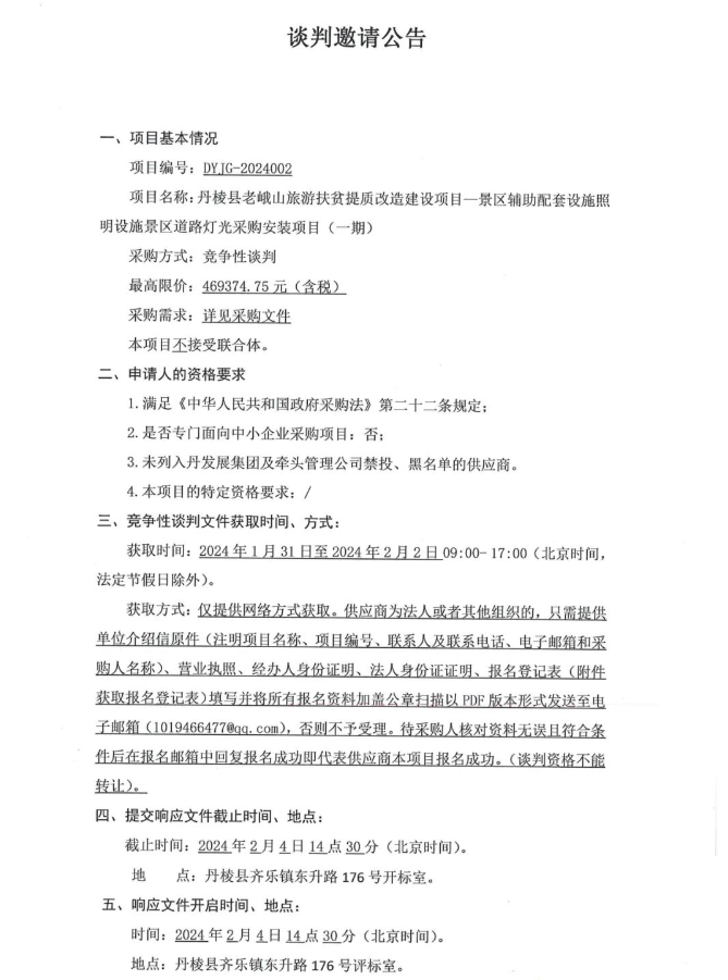 丹棱縣老峨山旅游扶貧提質(zhì)改造建設項目——景區輔助配套設施照明設施景區道路燈光采購安裝項目(一期)談判邀請公告