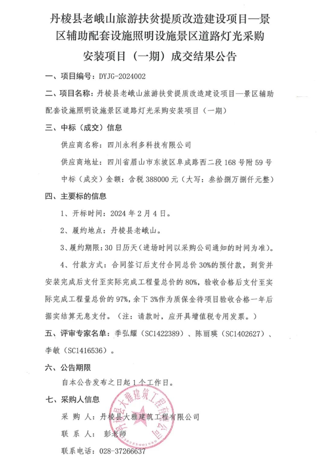 丹棱縣老峨山旅游扶貧提質(zhì)改造建設項目—景區輔助配套設施照明設施景區道路燈光采購安裝項目(一期)成交結果公告