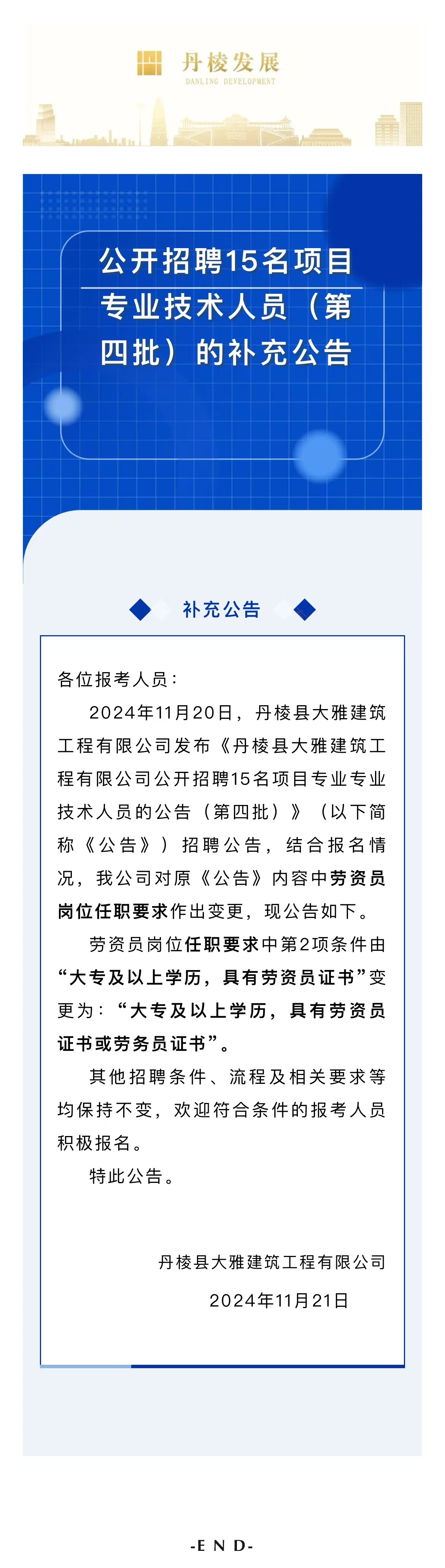 丹棱縣大雅建筑工程有限公司關(guān)于公開(kāi)招聘15名項目專(zhuān)業(yè)技術(shù)人員(第四批)的補充公告