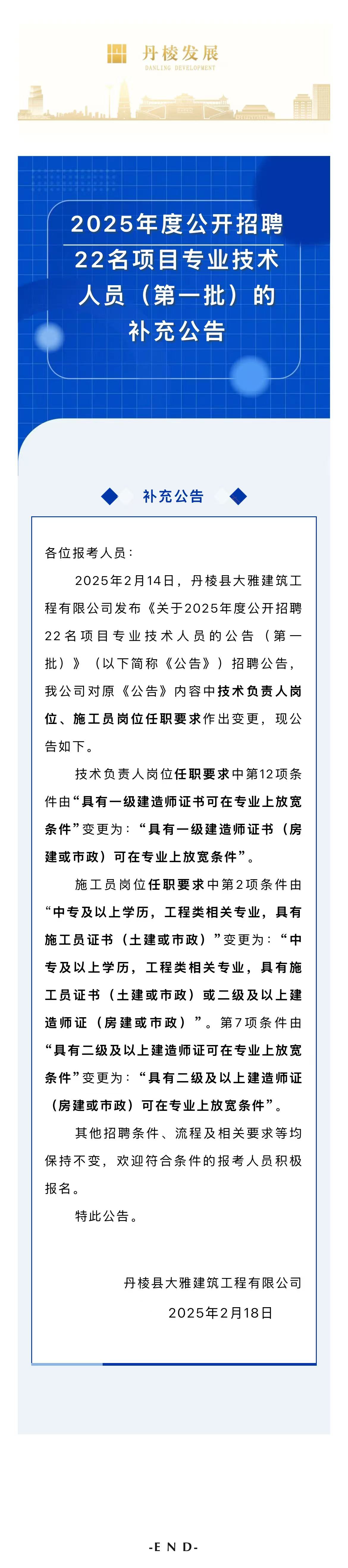 丹棱縣大雅建筑工程有限公司關(guān)于2025年度公開(kāi)招聘22名項目專(zhuān)業(yè)技術(shù)人員(第一批)的補充公告