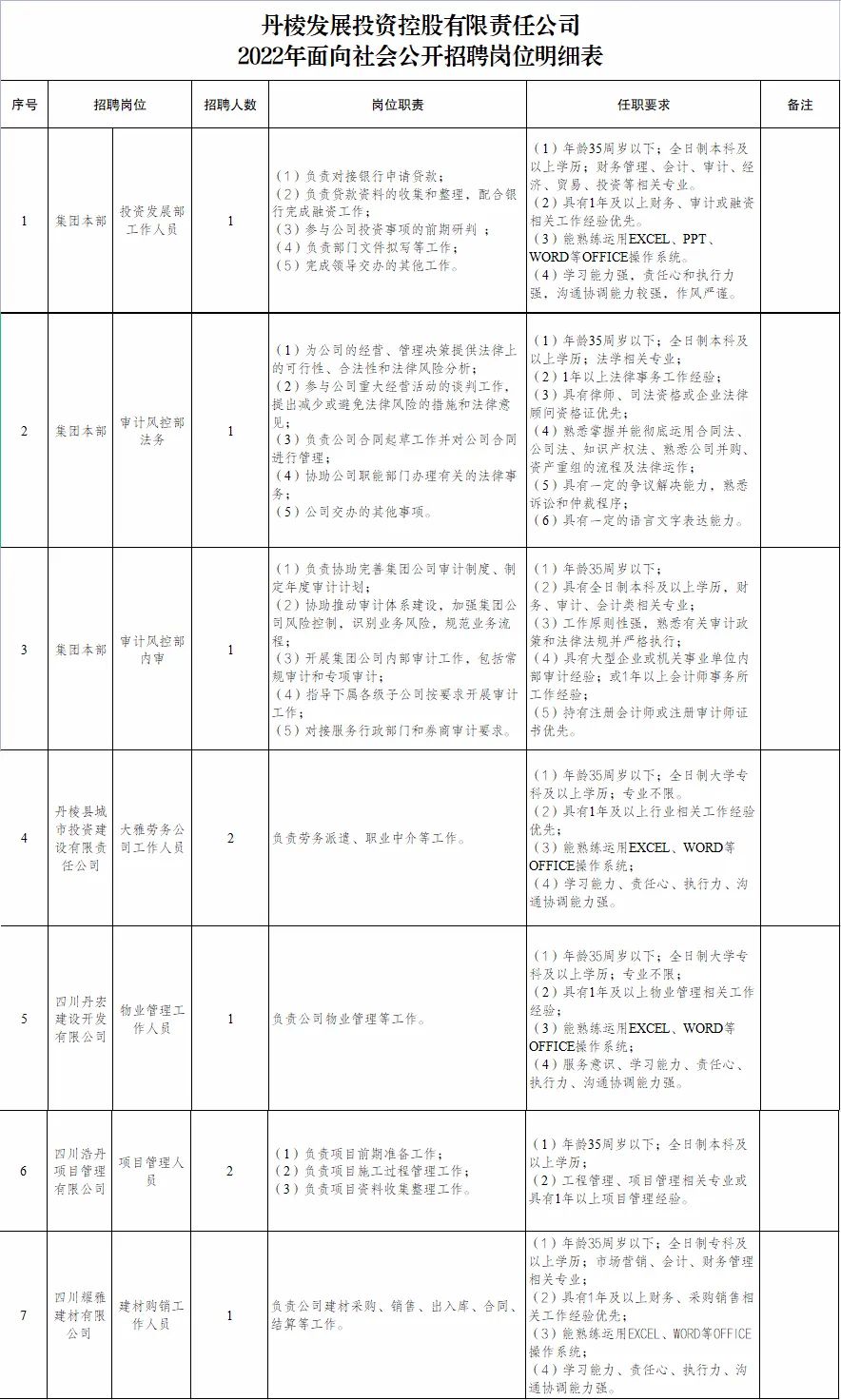 招聘崗位的學(xué)歷、專(zhuān)業(yè)、資歷、年齡等資格條件詳見(jiàn)附件《丹棱發(fā)展投資控股有限責任公司2022年面向社會(huì )公開(kāi)招聘崗位明細表》。