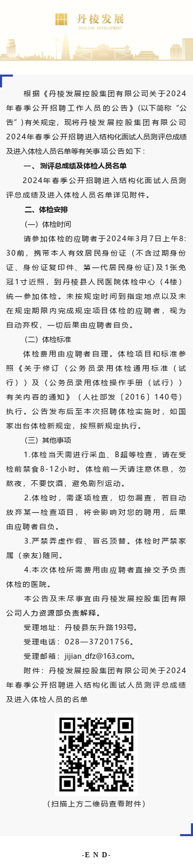 丹棱發(fā)展控股集團有限公司關(guān)于2024年春季公開(kāi)招聘進(jìn)入結構化面試人員測評總成績(jì)及進(jìn)入體檢人員的公告