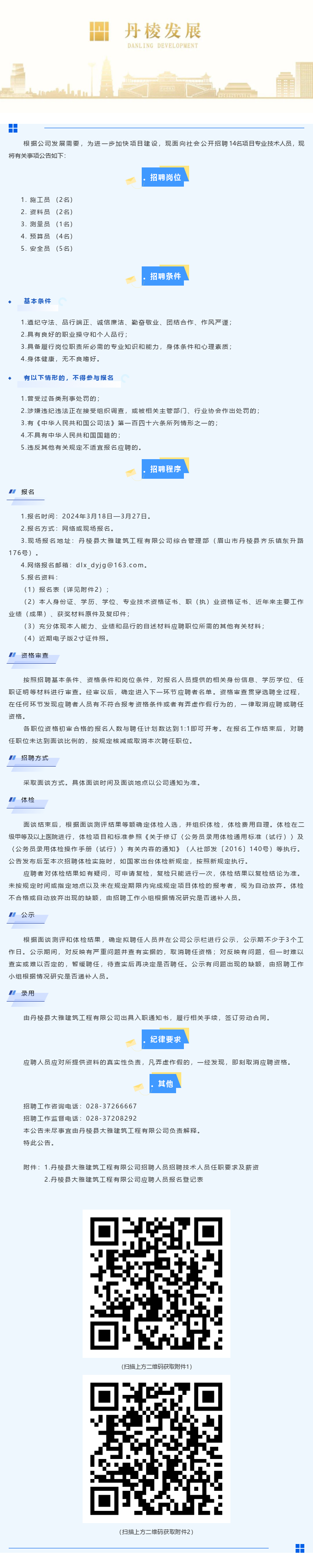 丹棱縣大雅建筑工程有限公司關(guān)于公開(kāi)招聘14名項目專(zhuān)業(yè)技術(shù)人員的公告(第二批)