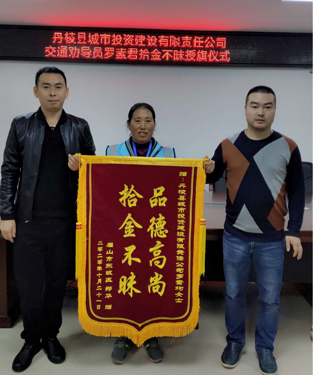 10月20日傍晚,丹棱縣城市投資建設有限責任公司交通勸導員羅素君在南岸A區路邊停車(chē)位值守時(shí),撿拾到一個(gè)錢(qián)包,內有約1000元現金、身份證、銀行卡、發(fā)票資料、保險柜鑰匙、汽車(chē)鑰匙等重要物品。羅素君立即把此事上報公司并通過(guò)失主發(fā)票上的電話(huà)號碼聯(lián)系失主親手交還。
