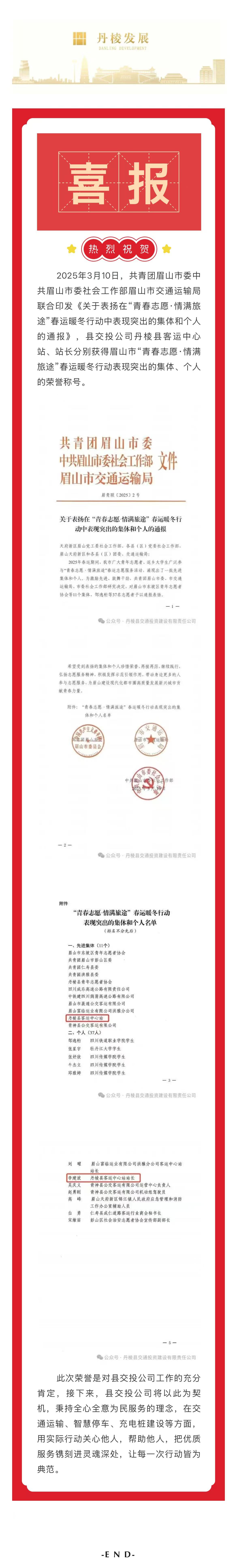 【縣交投公司】喜報!丹棱縣客運中心站、站長(cháng)分別獲得眉山市“青春志愿·情滿(mǎn)旅途”春運暖冬行動(dòng)表現突出的集體、個(gè)人榮譽(yù)稱(chēng)號