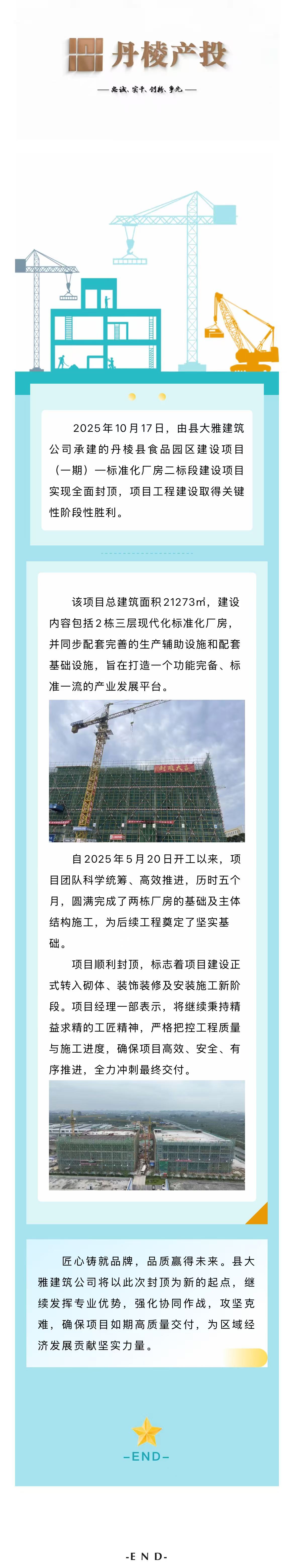 【縣大雅建筑公司】丹棱縣食品園區建設項目(一期)—標準化廠(chǎng)房二標段建設項目順利封頂