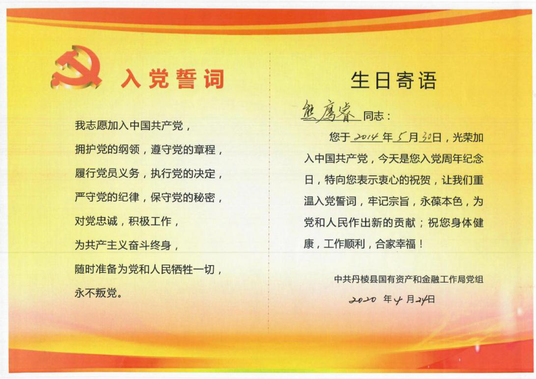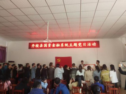 工作安排后,縣國資金融局黨組集體為5月入黨黨員過(guò)政治生日,縣國資金融局(縣金融服務(wù)中心)副主任茍永慶同志為“過(guò)生日”的黨員們送上精心制作的“黨員政治生日卡”,勉勵黨員同志要“常思入黨初衷、銘記入黨誓詞、牢記黨員義務(wù)”,發(fā)揮黨員先鋒模范作用,在今后的工作中不斷創(chuàng )先爭優(yōu),做好表率;顒(dòng)最后,全體黨員同志在縣國資金融局黨組成員、副局長(cháng)潘國榮同志的帶領(lǐng)下重溫入黨誓詞、面對黨旗莊嚴宣誓。