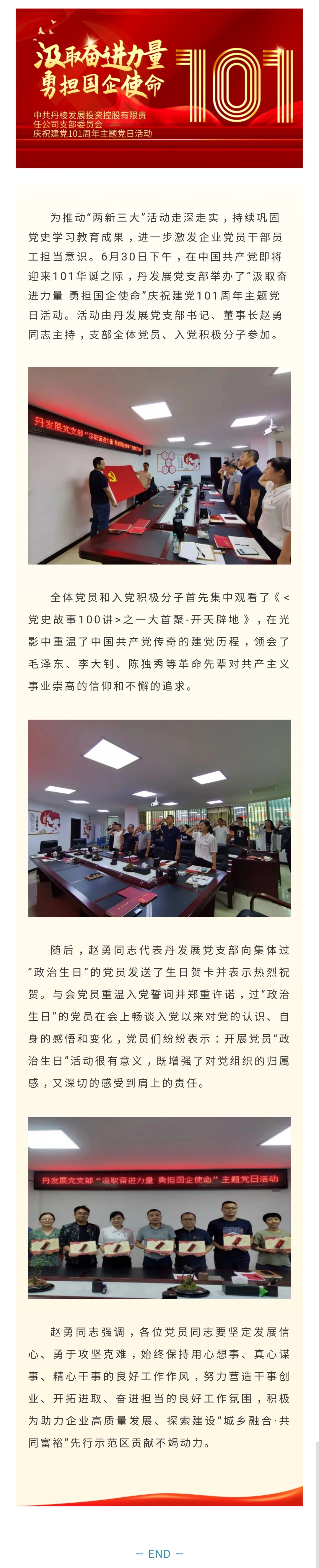 中共丹棱發(fā)展投資控股有限責任公司支部委員會(huì )“汲取奮進(jìn)力量 勇?lián)鷩笫姑睉c祝建黨101周年主題黨日活動(dòng)